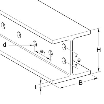 | Typ | H [mm] | B [mm] | t [mm] | d [mm] | e [mm] | e1 [mm] |